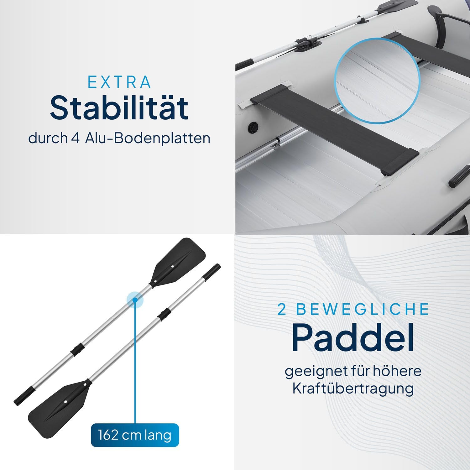 - ✔ Schlauchboot für 6 Personen: 380 x 170 cm großes aufblasbares Paddelboot in grau für Kinder und Erwachsene. Stabiler Aluboden. Extra Komfort durch 2 bequeme Sitzbänke. Traglast 727 kg.