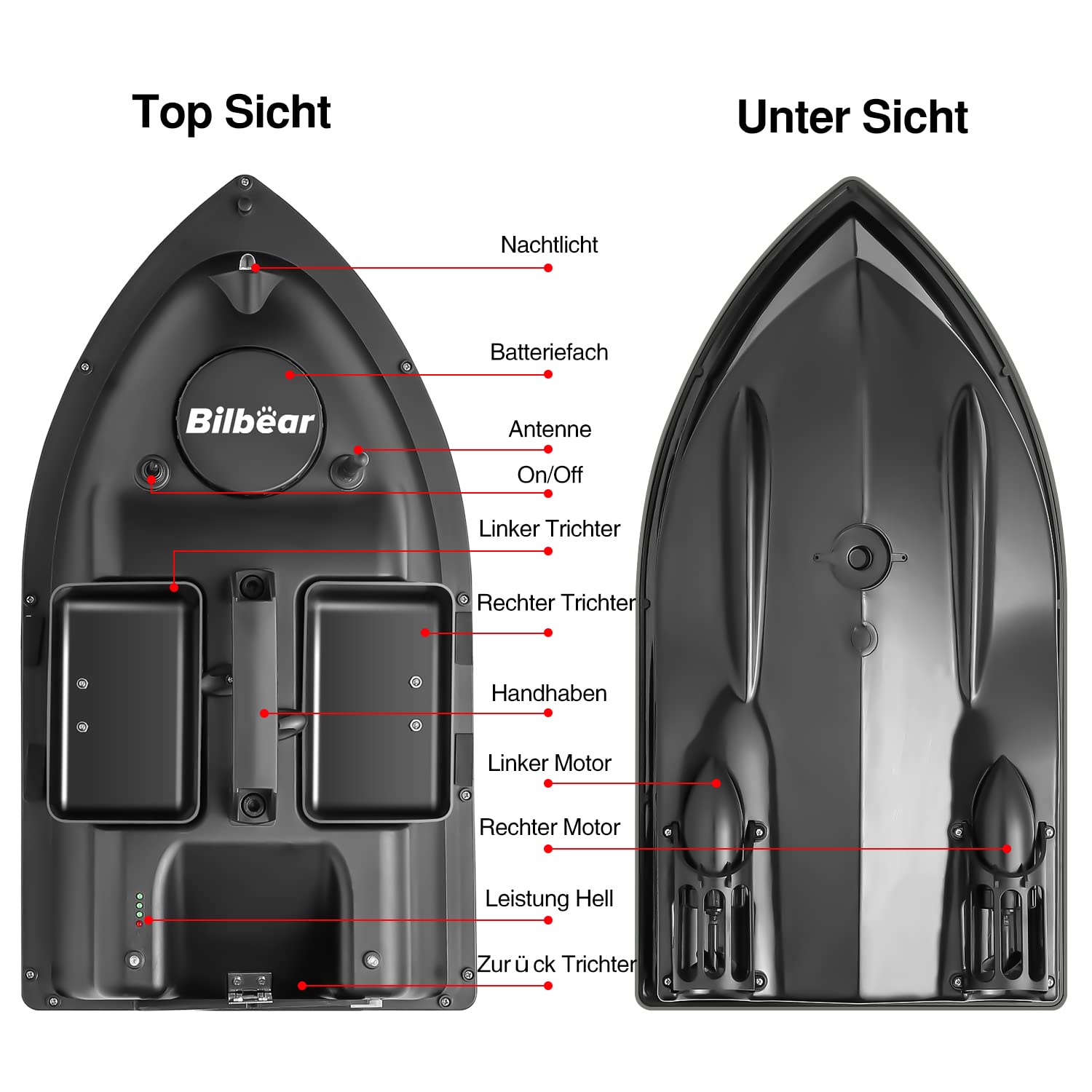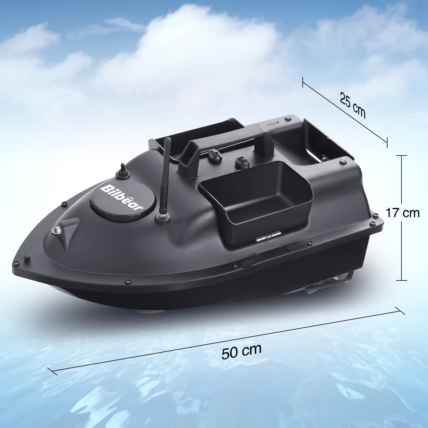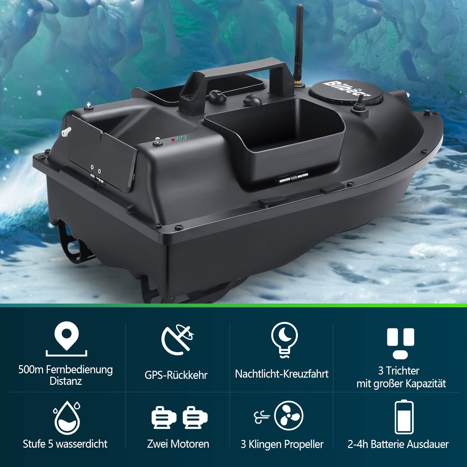 - 🐠【Die Struktur des Bootes】 Hergestellt aus ABS-Industriematerial, stabiler, wasserdicht, tragbar und schwimmfähig; Drei Trichter können mehr als 2 kg Köder laden. Leistungsstarke Doppelmotoren sind mit 3-Blatt-Propellern ausgestattet. Beurteilen der genauen Segelrichtung mit Nachtlicht.