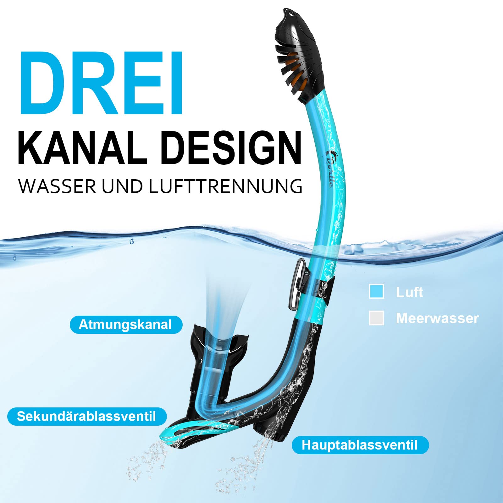 - Verbesserte Version des vollständig trockenen Schnorchel: Die Drei-Kanal-Ausführung, die für das Schnorcheln von Menschen geeignet ist, ist in Haupt- und Hilfsablassventile und Atemwege unterteilt, und der Wasserstrom ist von der Luft getrennt. Das Doppelschwimmer-Design auf der Oberseite des Schnorchels verhindert, dass Wasser in den Schnorchel eindringt, verringert das Erstickungsrisiko nach dem vollständigen Tauchen und macht das Schnorcheln sicherer.