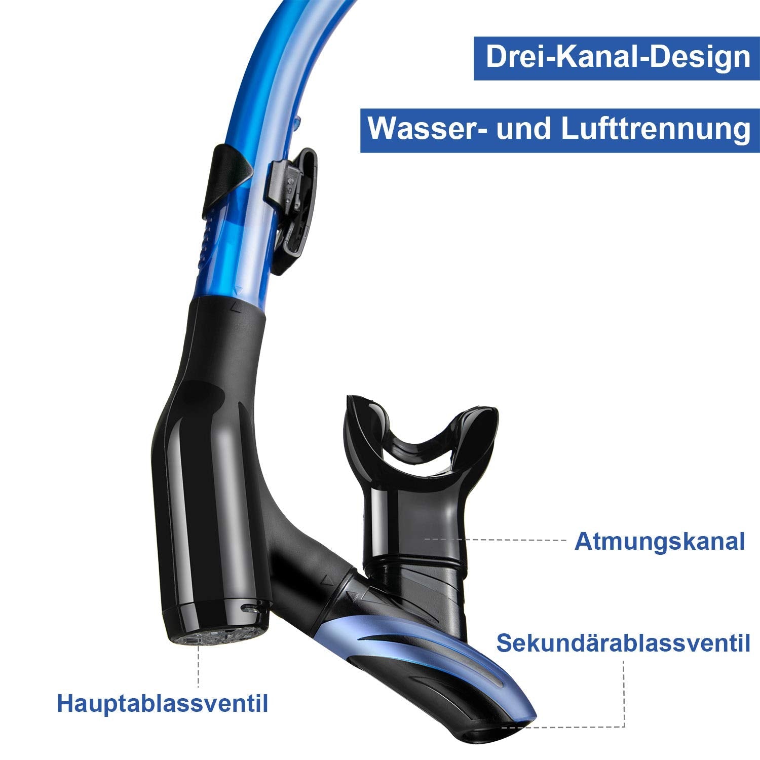- ★Verbesserte Version des vollständig trockenen Schnorchel: Die Drei-Kanal-Ausführung, die für das Schnorcheln von Menschen geeignet ist, ist in Haupt- und Hilfsablassventile und Atemwege unterteilt, und der Wasserstrom ist von der Luft getrennt. Das Doppelschwimmer-Design auf der Oberseite des Schnorchels verhindert, dass Wasser in den Schnorchel eindringt, verringert das Erstickungsrisiko nach dem vollständigen Tauchen und macht das Schnorcheln sicherer.