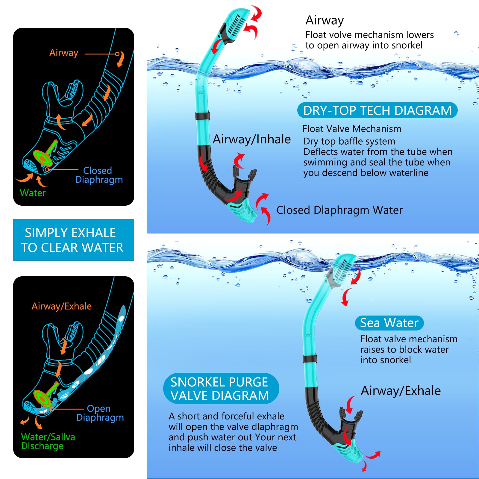 - 【Dry Top Anti-Splash Design】Schnorchelset für Erwachsene installiert ein Einweg-Einatmungsventil und hat einen mobilen schwimmenden Ball auf der Oberseite. Sobald das Rohr unter Wasser ist, wird der Rohreingang durch den schwimmenden Ball geschlossen, ob Sie schwimmen oder tauchen, können Sie es leicht handhaben.